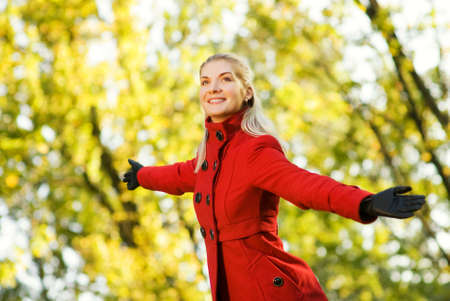 pretty girl in winter blue coat is standing outdoors on raised platform with her arms outstretched. Girl raised her hands to blue sky with white clouds. Copy space