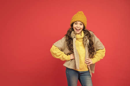 kid with happy face wearing warm winter clothing and get ready for holidays, copy space, autumn weather