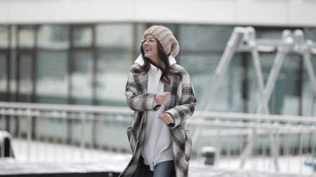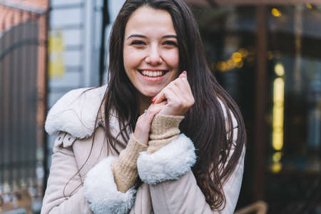 Beautiful smiling woman with long hair wearing warm jacket walk down street Warm european winter.