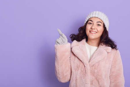 Lovely brunette female with happy expression, wears pink fur coat, cap and mittens, stands against lilac background, demonstrates blank space for promotion.
