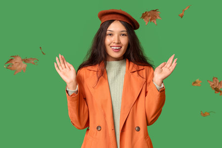 Hello autumn. happy stylish woman in brown coat and yellow hat with autumn yellow leaves outside in the city park in autumn.