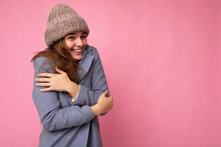 Shot of fascinating happy smiling young brunette woman isolated over pink background wall wearing grey autumn coat and grey warm hat looking at camera and feeling cold