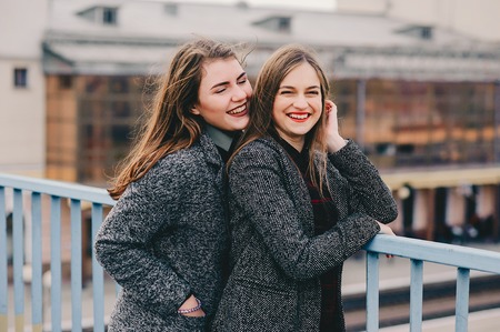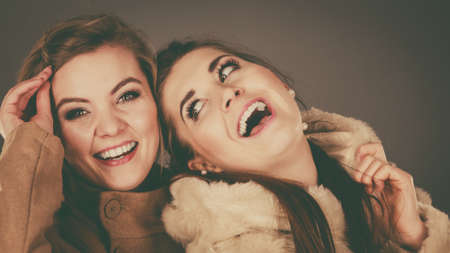 Two women, wearing light brown coat and furry jacket. Winter fashion concept.