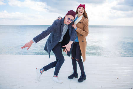 Fashionable young couple of Asian appearance in winter clothes hugs studio