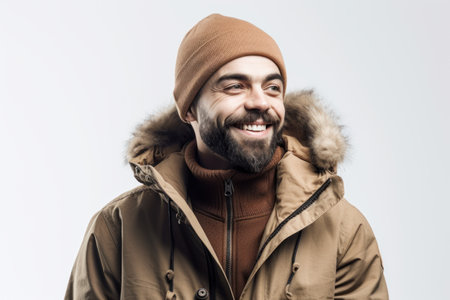 Portrait of a happy bearded man in winter jacket and hat smiling at camera