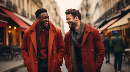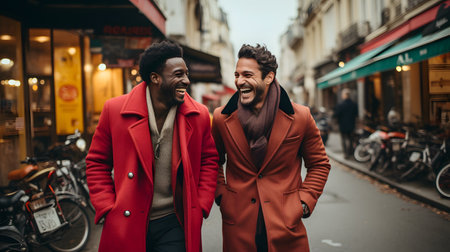 Two diverse men engaged in conversation, surrounded by vibrant colors and Parisian charm.