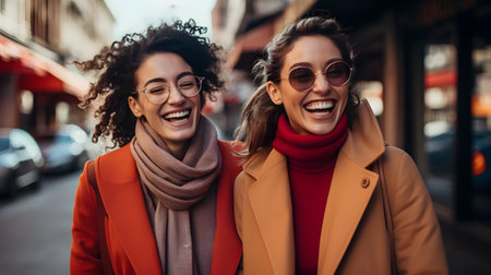 female companions giggling indignantly on an autumn day. Cute girl posing against a city backdrop in a black coat. AI generators