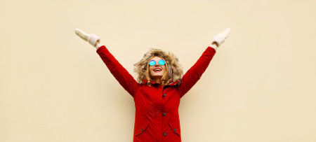 Winter season is open! Happy laughing woman raising her hands up and looking up enjoys wearing red jacket with fur hood, sunglasses and mittens on beige background