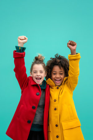 Two young girls express happiness while standing side by side with their fists raised. They wear vibrant red and yellow coats, showing their cheerful spirits against a bright background.