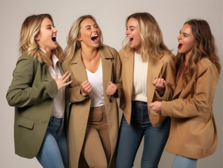 Young and carefree Full length of five beautiful young women bonding and smiling while standing against grey background : Generative AI