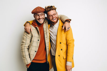 Two stylish older men dressed in bright street funky clothes, modern sunglasses on a bright pastel wall. Generative AI