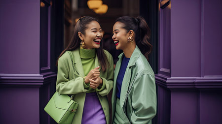 Two friends both dressed in effortlessly chic outfits exit a high-end store with bags in hand. One bag is a lively shade of lime green the other a vibrant shade of purple. They share a heartfelt laugh clearly thrilled with their shopping spree.