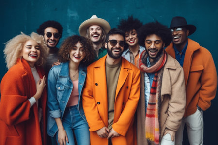 Close-up of a group of friends joyfully having fun, wearing colorful and trendy outfits on a city street.