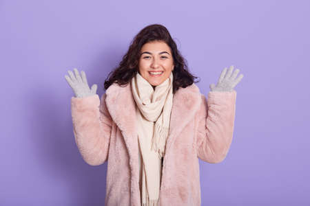Amazing beautiful lady raised hands in delight, wears fur coat, scarf and mittens, looks happy, has good news, rejoicing, smiles toothily, shows white teeth, isolated over lilac background.