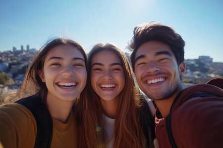 Three cheerful young students taking a selfie while visiting a city during a sunny day