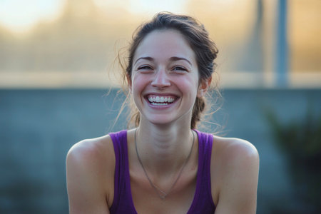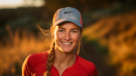Smiling Athletic Woman in Sunlit Outdoor Portrait with Cinematic Sky
