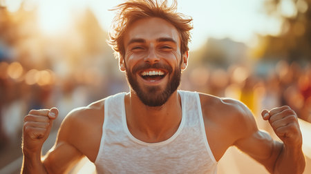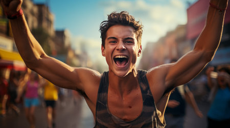 A smiling man raises his arms in triumph after finishing a competitive outdoor race. Bright yellow banners and a lively crowd create an energetic atmosphere on a sunny day.