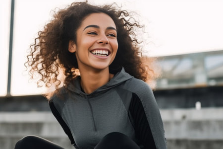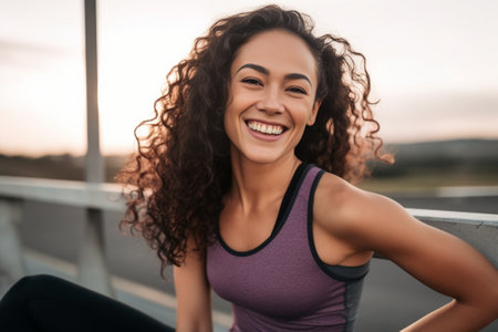 Fit and beautiful Attractive young woman in sports clothing looking away and smiling while sitting outdoors : Generative AI