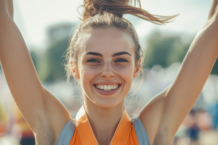 Portrait of a female athlete joyfully celebrating her victory with a medal at a sports event