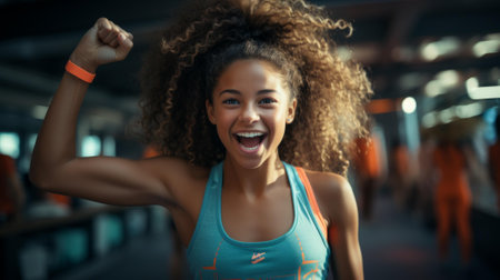 a young woman in sportswear jumping up in celebration after winning a race, created with generative ai