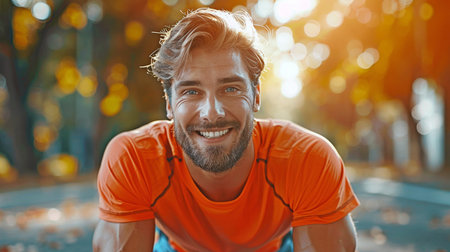 Smiling young man standing on running track at stadium during sunset, looking happy and motivated