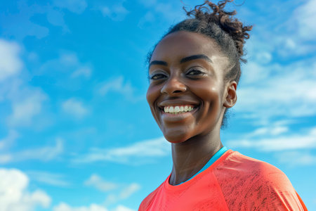 Portrait of smiling black woman in sportswear, doing sports outdoors against a blue sky background, professional photography