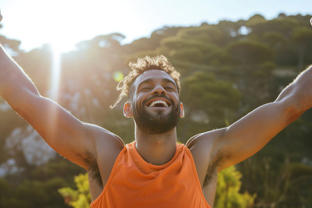 Joyful Man Celebrating Success Outdoors in Nature with Sunlight in the Background.