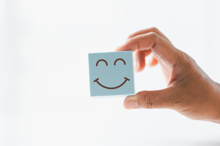 Hand choosing and showing happy smile face, good feedback rating and positive customer review, think positive, compliment and rating concept.