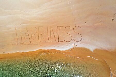 Aerial top shot from ocean waves and handwritten Happiness at the beach