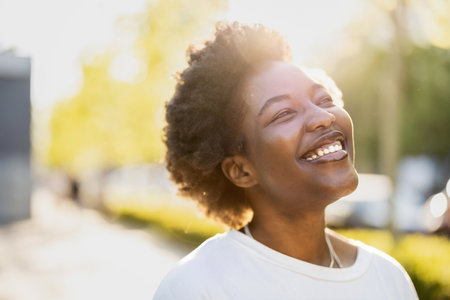 Smiling woman with braided hair showing teeth in sunny portrait, with colorful lens flare overlays. Portrait, vibrancy, joy, lifestyle, fashion, outdoor, radiant