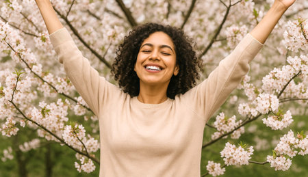 Young african american woman smiling joyfully with raised arms among blooming cherry blossoms in spring. concept of happiness, nature appreciation, joyful expression.