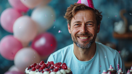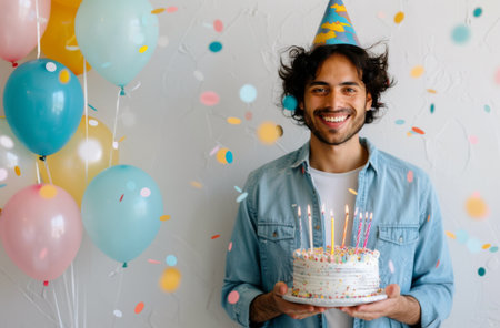A man in a blue shirt and party hat smiles and holds a birthday cake with candles in front of a blue wall decorated with balloons and confetti.