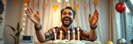 Best birthday Happy young man celebrating birthday among friends while standing in room with confetti flying around : Generative AI