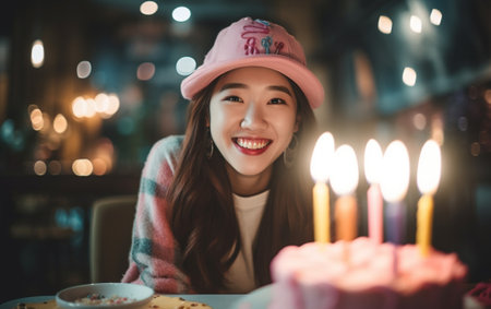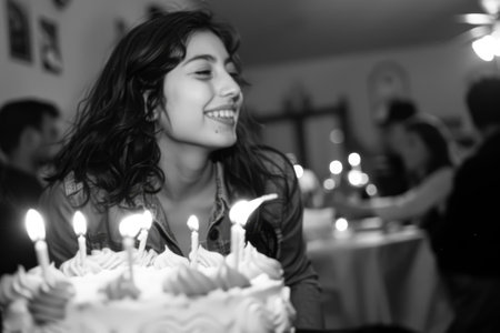 shot of a young woman celebrating her birthday at home, created with generative ai