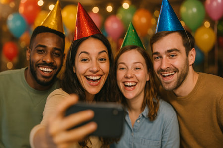 Friends gather at a vibrant celebration, wearing colorful party hats and smiling as they take a selfie amidst a backdrop of balloons, showing happiness and joy.