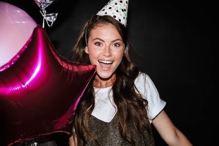Image of young excited woman in party cone holding balloons and smiling isolated over black wall