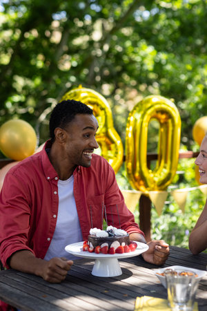 Man celebrating birthday outdoors with cake and balloons, smiling and chatting. Celebration, party, happiness, festive, cheerful, gathering