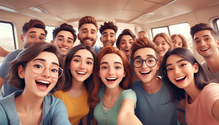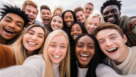 Global smiles: capturing joy in group selfies of cheerful and happy young people diverse nationalities, celebrating unity, friendship, cultural harmony in shared moments of happiness and togetherness