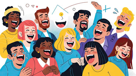 An illustration depicts a diverse group of people expressing joy through laughter. The artwork showcases various skin tones and hairstyles, rendered in vibrant colors and a cartoon style. The composition suggests an inclusive environment. It could be suitable for use in various commercial and editorial contexts related to happiness.