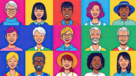 This vibrant illustration presents a collection of diverse portraits, each in a unique style and color palette. The subjects, of varied ages and ethnicities, smile warmly. The composition, marked by clean lines and bold colors, could be used for editorial content or commercial projects focused on community or representation.