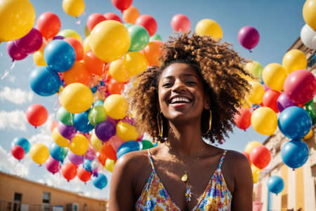 Happy young Afro-American woman at a celebration with balloons on a sunny summer day. Joyful young Afro-American woman at a celebration with balloons on a sunny summer day.