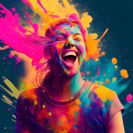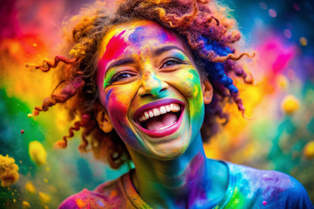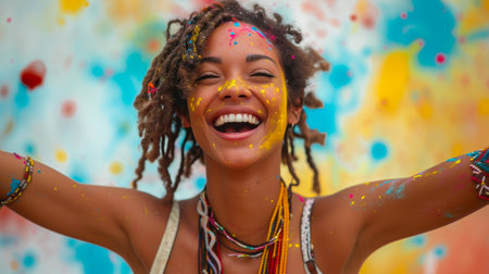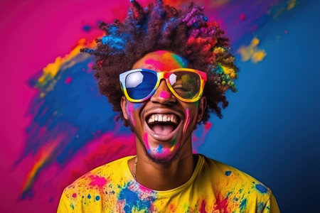 A man bursts into laughter, his cheerful expression radiating happiness, his face adorned with bright, vivid colors from a festival celebrating joy and unity, set against a colorful backdrop.