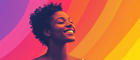 A Smiling individual with curly hair against vibrant rainbow background, expressing joy and confidence