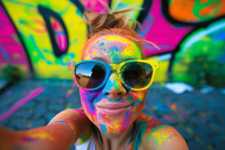 A woman wearing sunglasses covered in vibrant and colorful paint.