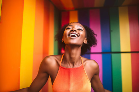 A beaming smile from a young woman in a pastel-colored top, standing before a rainbow-painted wall. The warm lighting enhances her natural beauty and the joyful ambiance of the photo. AI generation