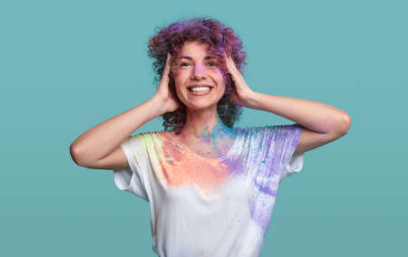 Festival Holi: Portrait of a beautiful young woman with bright make-up and colorful paint splashes.