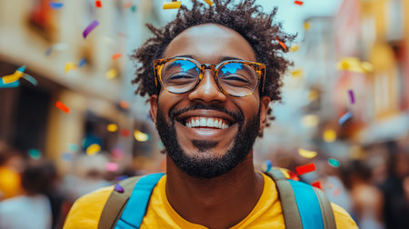 A joyful man smiles brightly in a lively street celebration with colorful confetti.