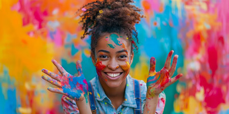 Delightful young girl with curly hair and face smeared with vibrant paint colors, smiling brightly in front of a colorful backdrop.