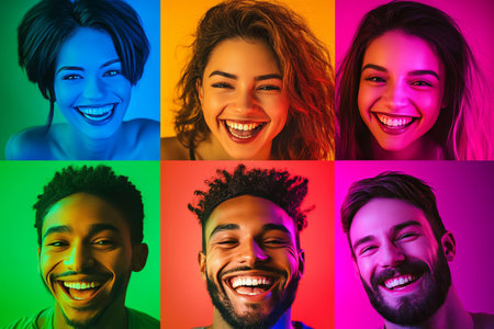 Diverse happy people smiling portraits on vibrant colorful backgrounds showing joy positivity inclusion happiness celebration multicultural community diversity concept.