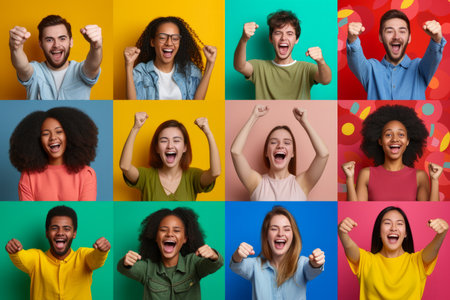 Collage of diverse individuals showcasing different emotions while standing in front of vibrant, colorful backgrounds. Joy, happiness, and diversity captured in a studio setting.